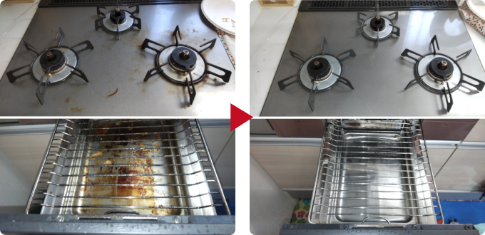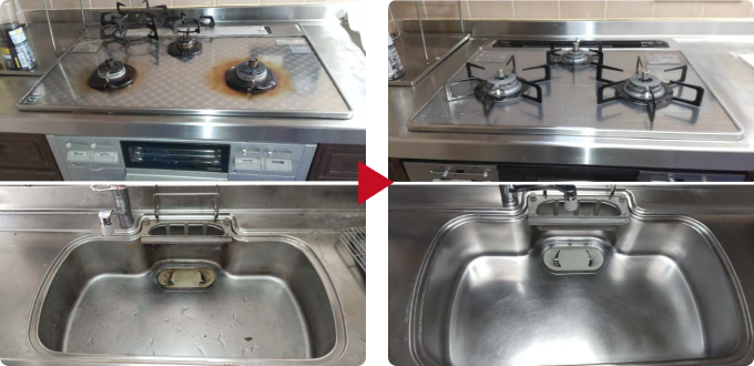 コンロの油汚れやシンクの水垢、排水管のヌメリまで徹底洗浄。