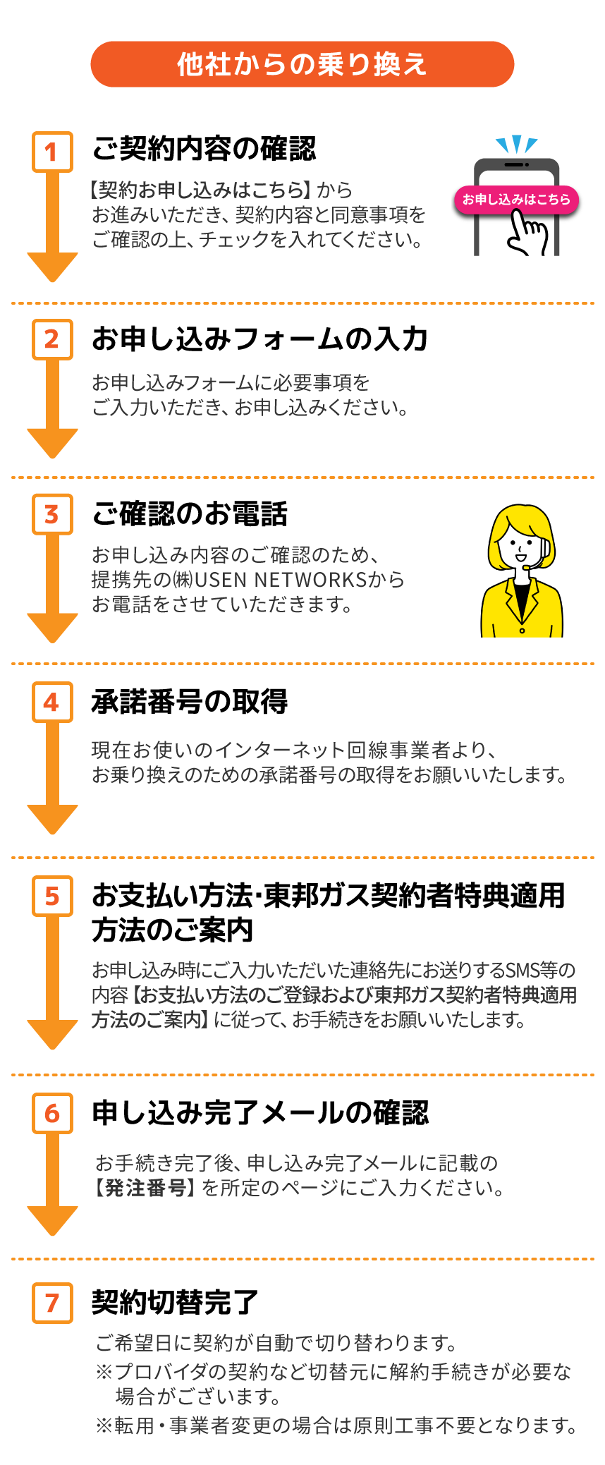新規の場合:お申し込みから概ね1か月前後でご利用開始が可能です。事業者変更・転用の場合:お申し込みから概ね2週間前後でご利用開始が可能です。