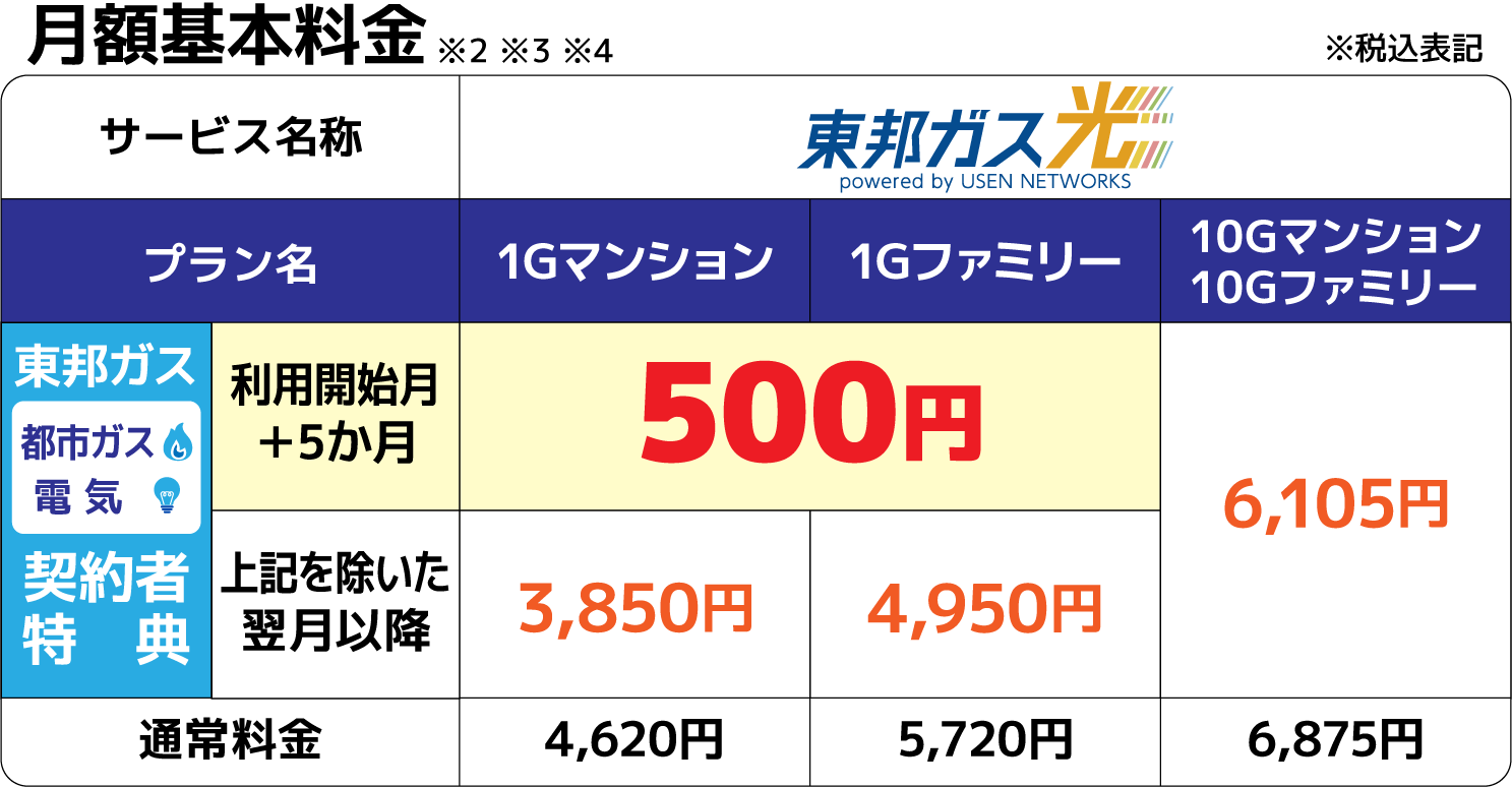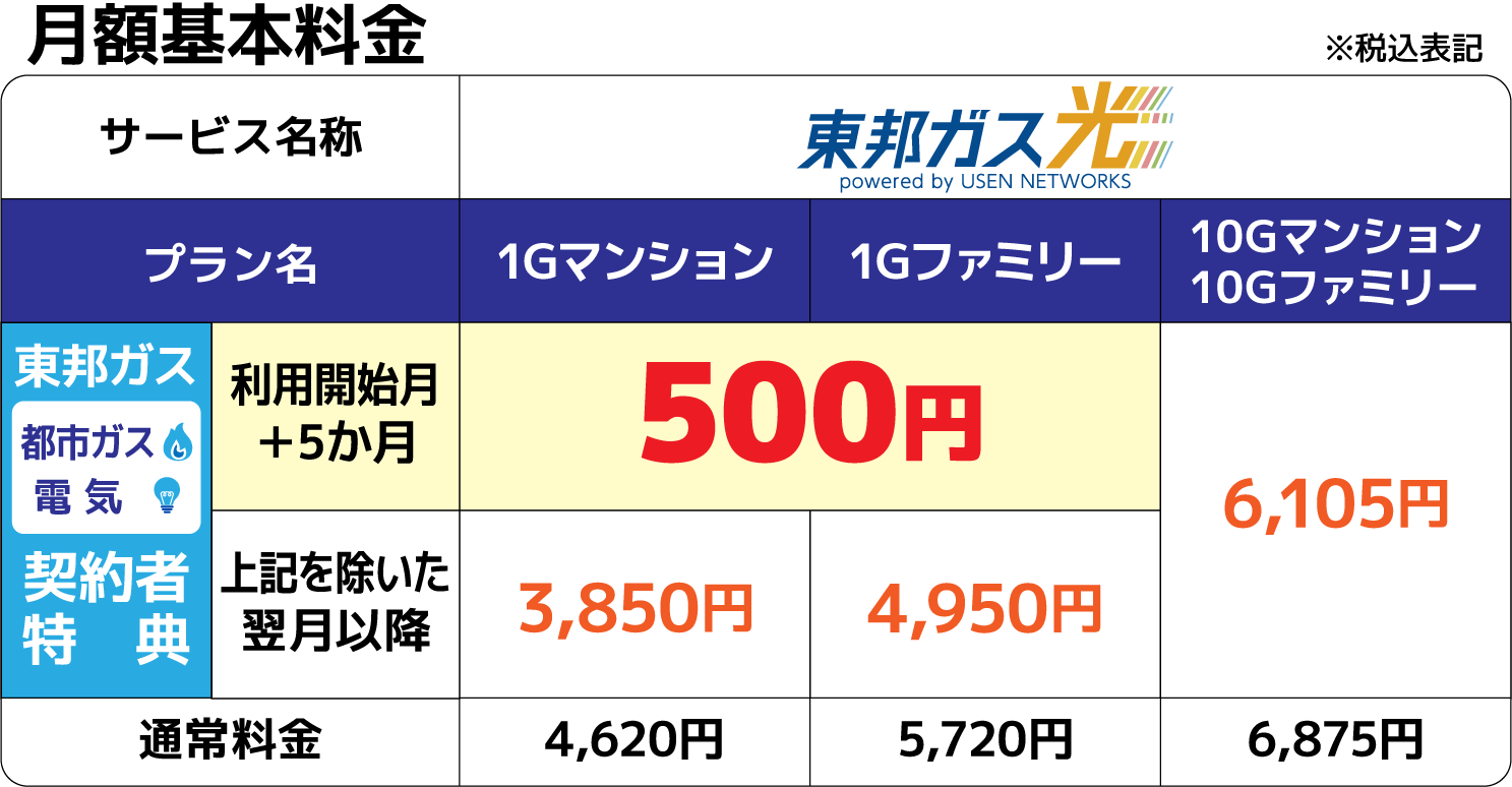 - 過去に、同一住所および同一名義にて「東邦ガス光」をご契約いただいている場合、東邦ガス契約者特典のうち、1Gマンション・1Gファミリープランに適用される特典(a)は適用対象外となり、利用開始月から特典(b)が適用されます。